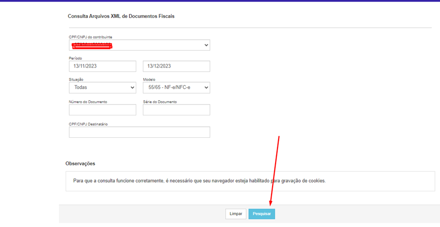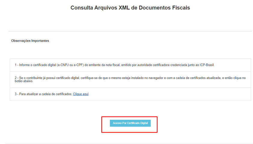 Depois selecionar a opção “Arquivo XML dos Documentos Fiscais” no site: